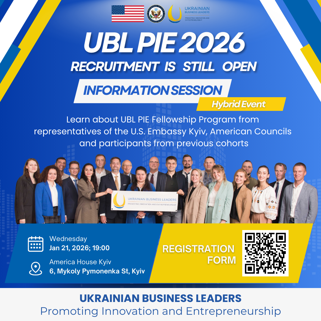 Would you like to learn more about the Ukrainian Business Leaders: Promoting Innovation and Entrepreneurship (UBL PIE) 2026 program? We invite you to America House Kyiv for a program presentation and an informal gathering with program alumni next week!